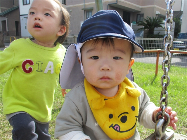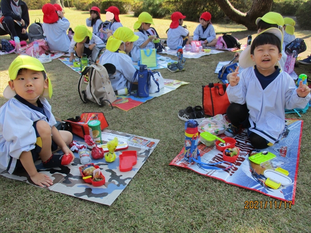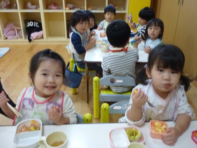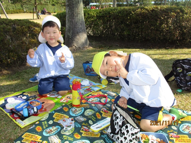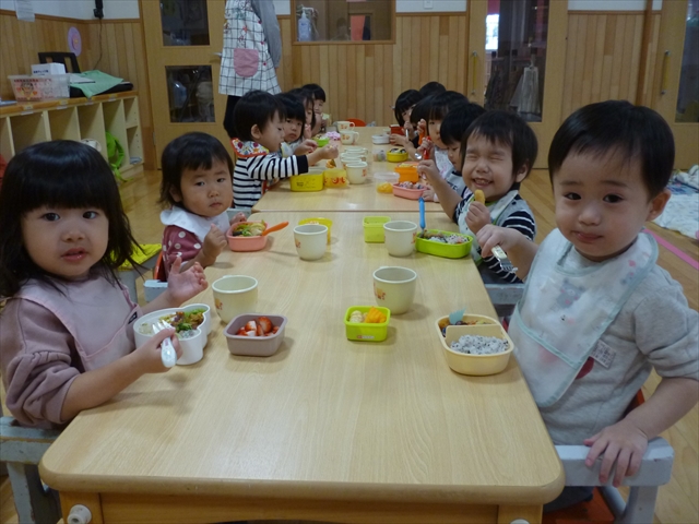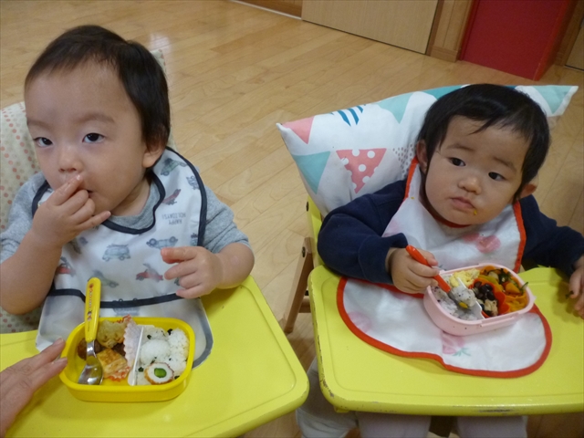 未満児さんは園庭で遊んだり、公園までお散歩をして過ごしました。お昼には、おいしいおいしいお弁当でにっこり元気百倍!