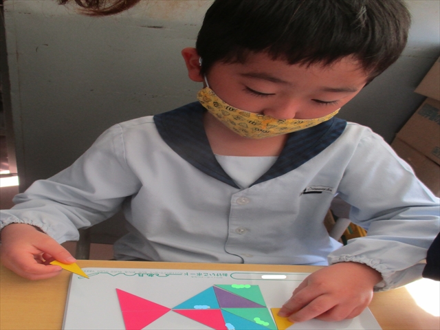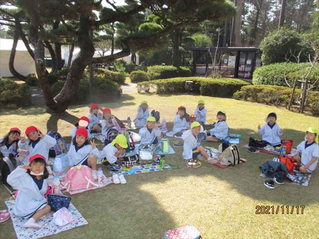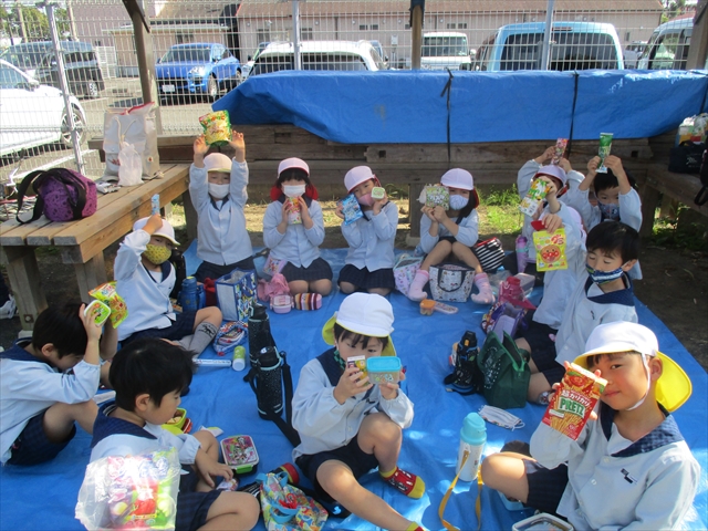 ゆりぐみさんは、東大宮小学校へ体験学習へ行きました。小学1年生のお兄さんお姉さんたちが、手を挙げて答える姿の授業風景を見学したり、実際に「図形」のお勉強を一緒に体験したり、貴重な時間を過ごしました。片道2kmを往復した子ども達は、保育園近くの公民館の広場でお弁当を広げてたのしく食べました。