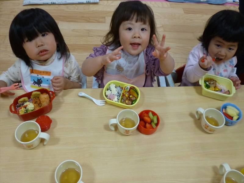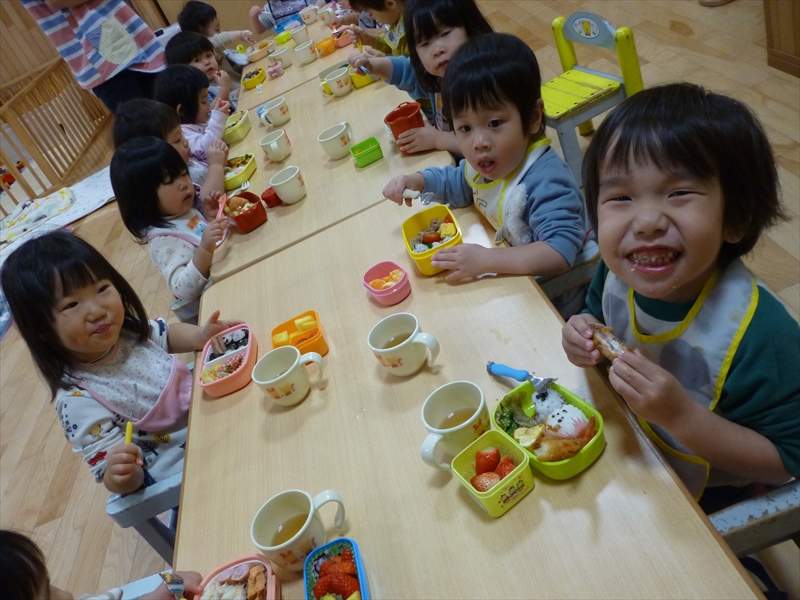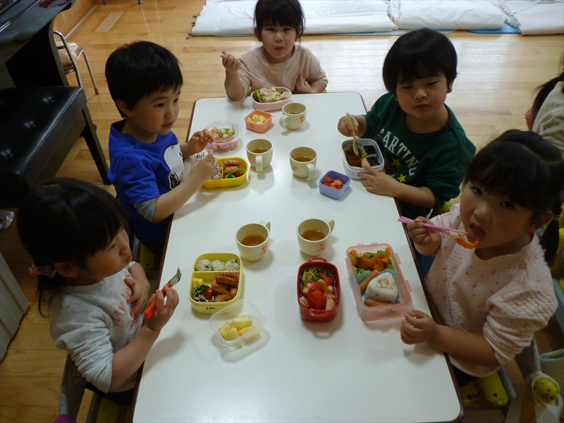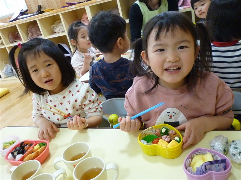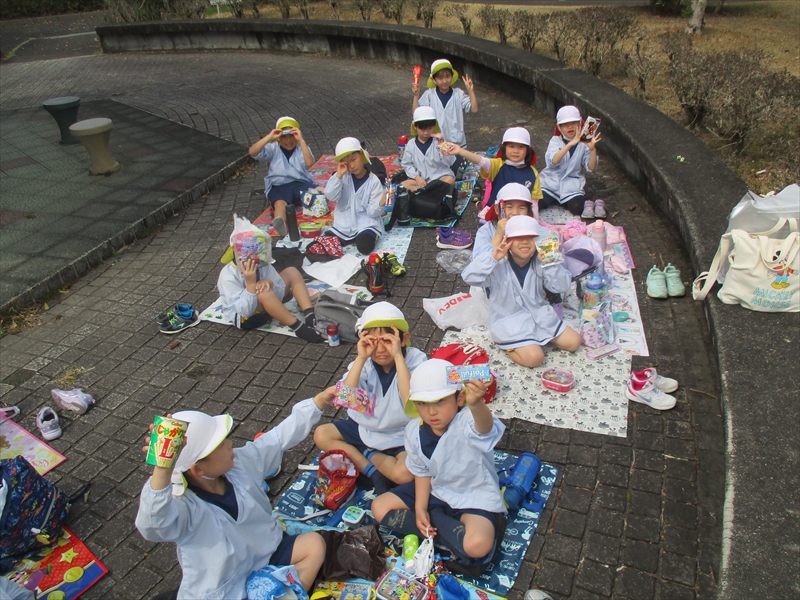 ゆりぐみさんも保育園での最後の遠足で最後のお弁当。夫々持ってきたお菓子を交換したりしてうれしそうでした。