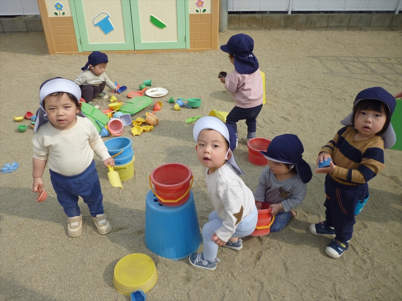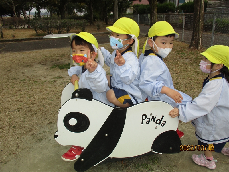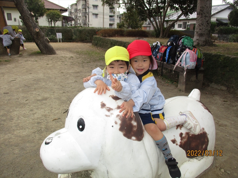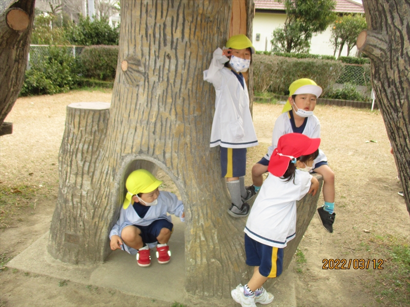 2月の遠足を3月に振替え、もも・うめ・ゆり3クラスで近隣公園まで遠足に行きました。広い公園、いろいろな遊具、仲良しのおともだちとたくさん遊びました。