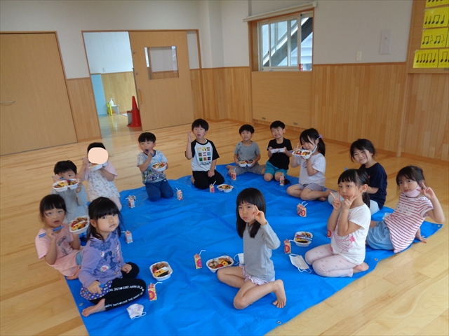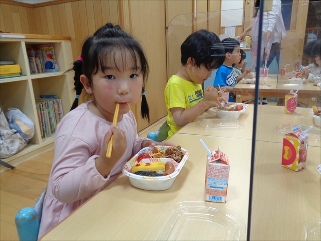 そして、みんなのおたのしみ💛ごちそうは「こいのぼりお弁当」🎏給食の先生が、屋上でシートを拡げて食べれるようにお弁当箱とパックのジュースを準備してくれましたが、あいにくのお天気だったので、ゆりうめさんはホールで食べました。蓋つきのお弁当にいろんな形のこいのぼりがたくさん泳いでいてみんな大喜びでしたよ。
