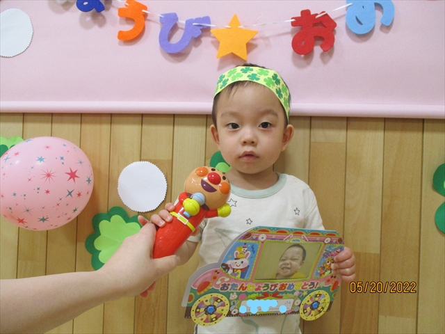 5月生まれのお誕生会の様子です。今月も感染対策のため各クラスでのお祝いになりました。前へ立ってマイク片手に自己紹介をしたあと、聞いてもいないのに「お寿司をたべたよ」などたくさんお話をしてくれるおともだちや、練習ではできてたインタビューにはずかしそうに答えたりするおともだちなどたくさんの表情を見せてくれました。