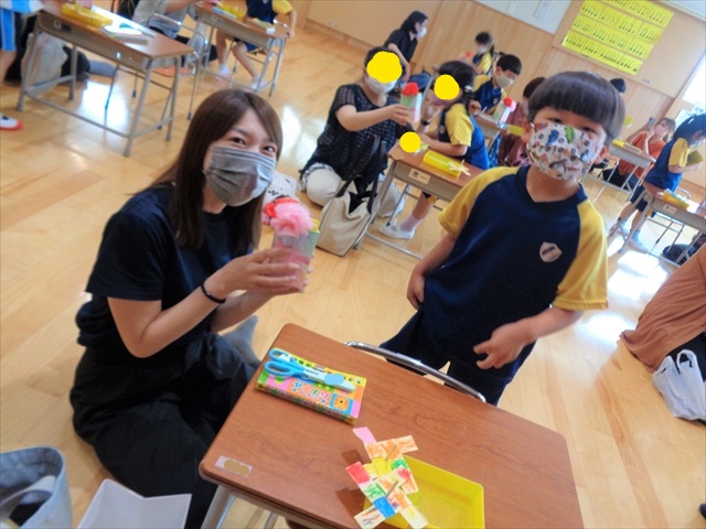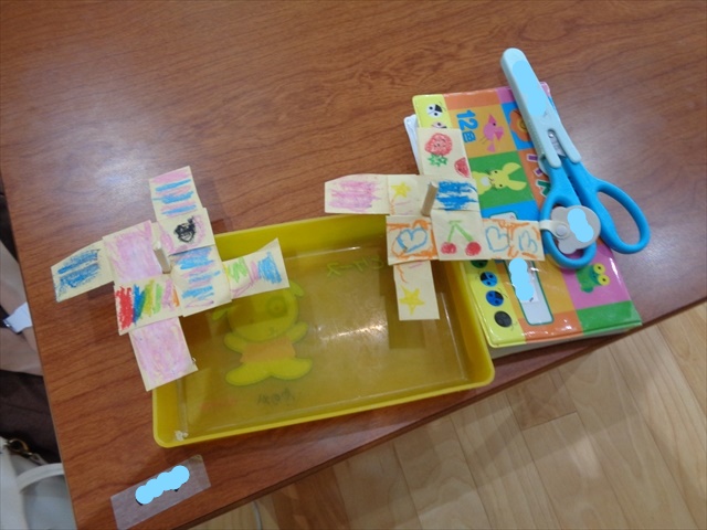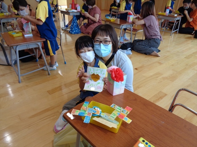 火曜日、ゆりぐみさんはホールでお家の方と一緒に「こま」の制作をしました。封筒をハサミで切り、色を塗った後、卍に組み合わせ棒を装着。卍の組み立てに悪戦苦闘しながらも、夫々カラフルな「コマ」が時間ギリギリで出来上がり、遊ぶ時間はかえってからのおたのしみになりました。最後には、ファミリーデーで、子ども達が作ったお花付のペン立てとお手紙をプレゼントし笑顔で終わりました🎁