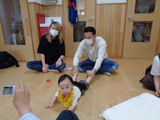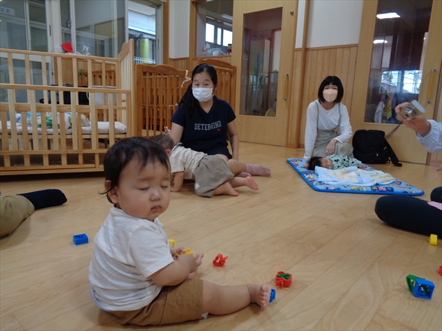 水曜日、赤ちゃんたちの参観日でした。ママパパと一緒に落ち着いた様子のつぼみさん。おもちゃを手ニコニコ笑顔を見せてくれたり、中には、お布団にゴロンして気持ちよさそうに眠っている子もいてたり、ママパパは職員とゆっくり話したりほのぼのとした雰囲気の中で過ごすことができました。