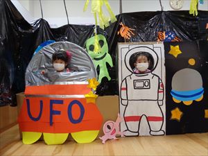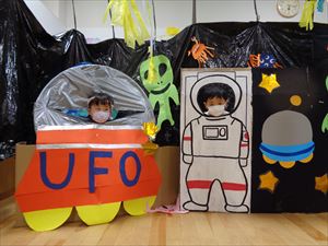 宇宙の世界へ遊びに行った子どもたち、迷路や宝探し、的あてやボーリング、オリジナルライト作りなどを子ども達だけで楽しく過ごしました。