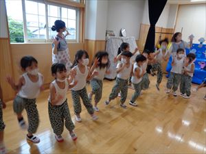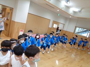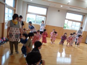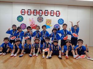 オープニングが終わったあとは、もも組さんも集合しおやつをもらってみんなで一緒に食べた後は、盆踊りをしました。
