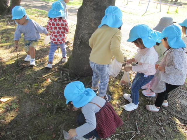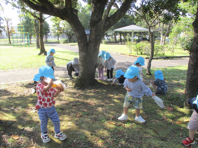 未満児さんは、お散歩に行ったりホールで遊んだり、たんぽぽさんは、どんぐり拾いへ片道30分計1時間以上も泣かずにがんばって歩きました。お土産にどんぐりが届くかもですよ~