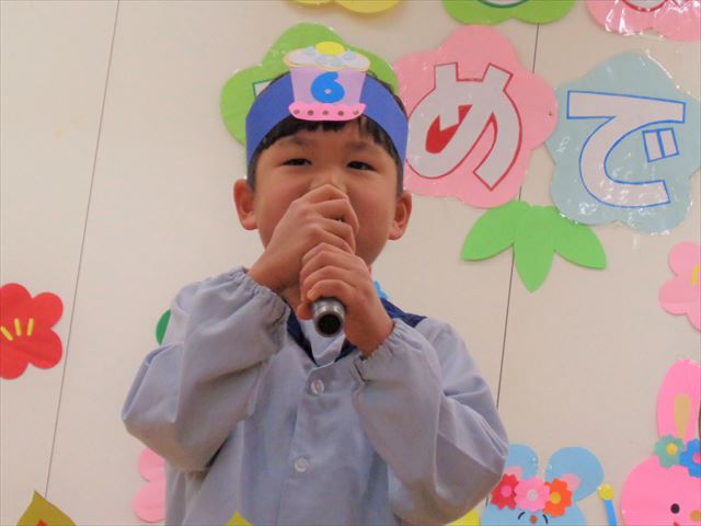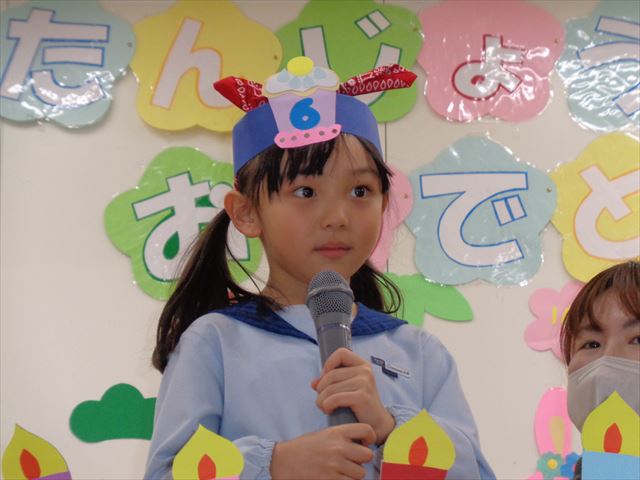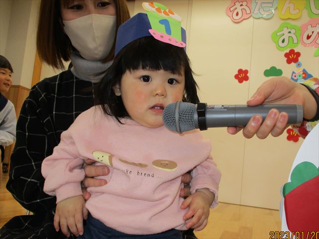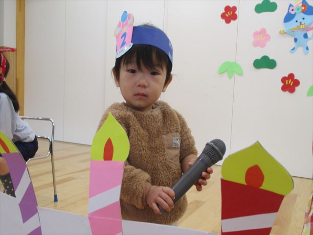 保育園で迎える初めてのお誕生会のおともだちも泣かずに、マイクを持ったり、かわいい冠をつけてもらったり、プレゼントのお話をしてくれたり、とっても楽しくすごしました。