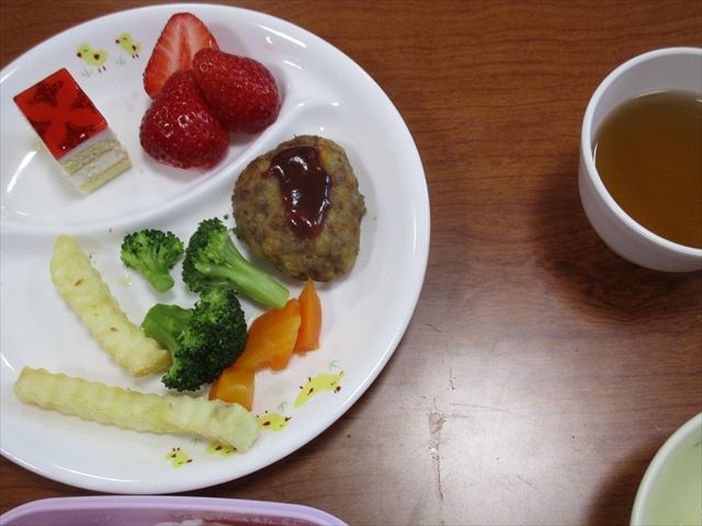 今日のメニューはハンバーグ&ポテトやフルーツにケーキまでたくさんのごちそうをたべました。