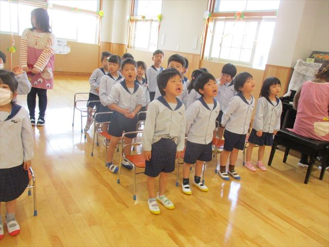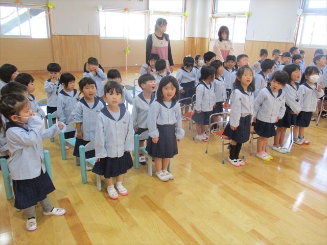 ホールでは、以上児の進級した子ども達がしっかりした表情で式に参加していました。先生のお話もちゃんと聞けて、元気な声でお返事もできました。