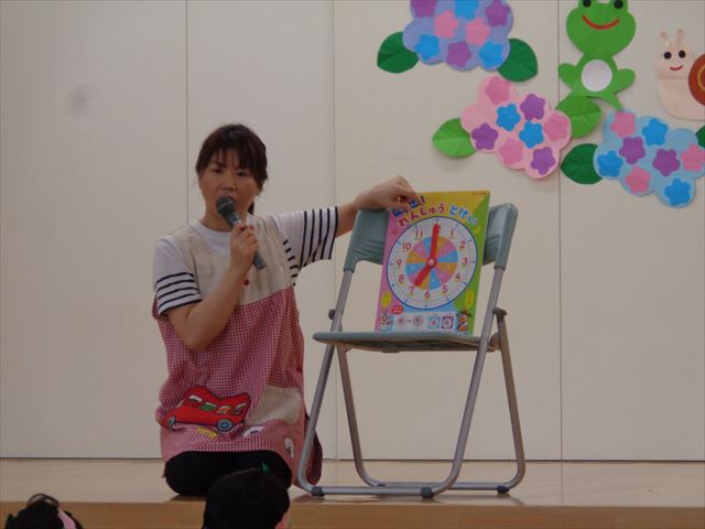 「みんなが保育園に来る時間は?」「おやつの時間は?」と、先生の出すクイズにみんな元気よく手を上げ答えていましたよ