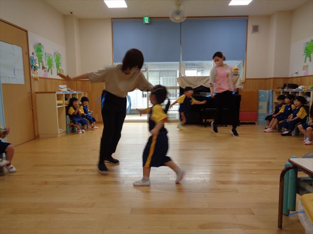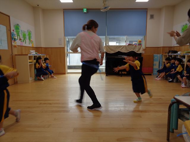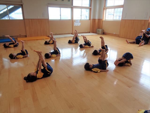 ホールでは体操教室。先生の指導の下うめさんは柔軟体操中でした。ゆりさんは運動会に向け組体操の順番決めをしていました。一人ひとり真剣に楽しそうに交代しながら、前のおともだちの足を肩と腕で支えることができるかどうか・・・ここから始まります。