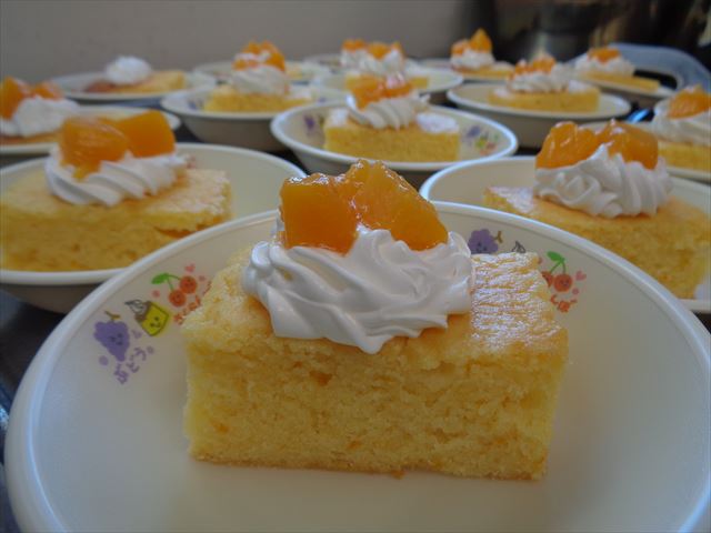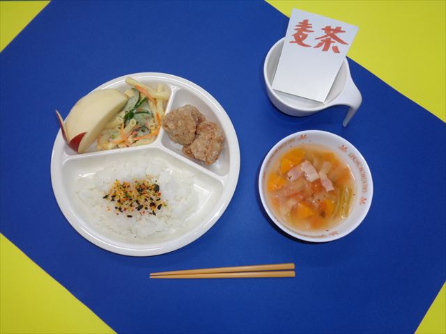 給食の時間のごちそうは「からあげ、マカロニサラダ、トマトのスープ、ウサギりんご」でした