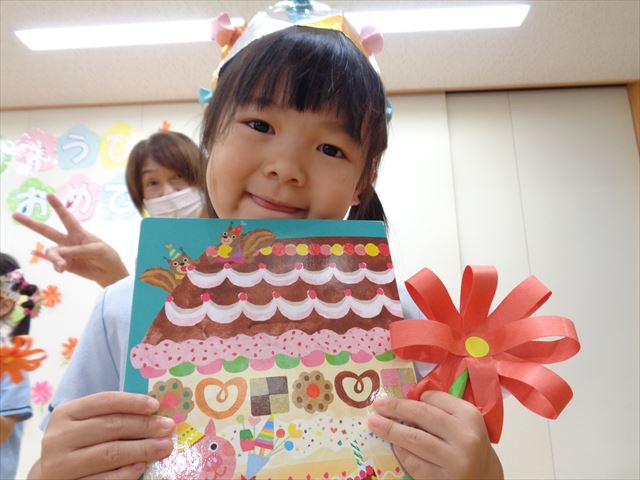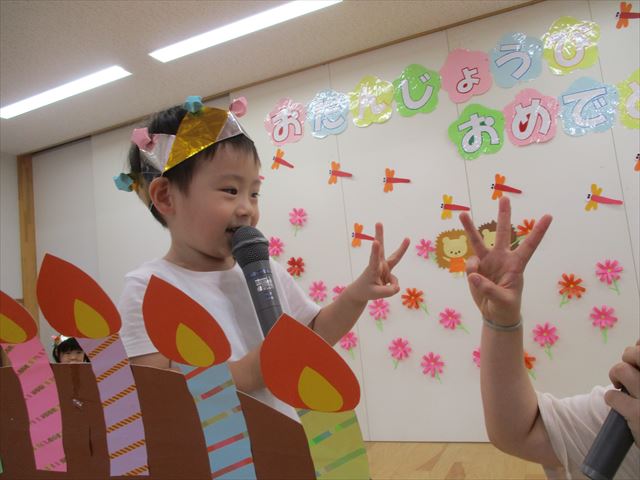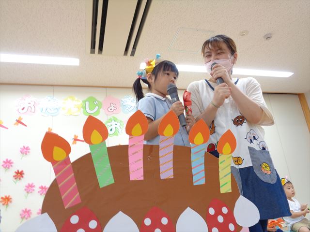 インタビューでは、大好きなおともだちと毎日一緒にたのしくあそんでいる様子を教えてくれたり、好きな歌の「とんぼのめがね」をみんなで合唱したり、とてもたのしいお誕生会になりました。
