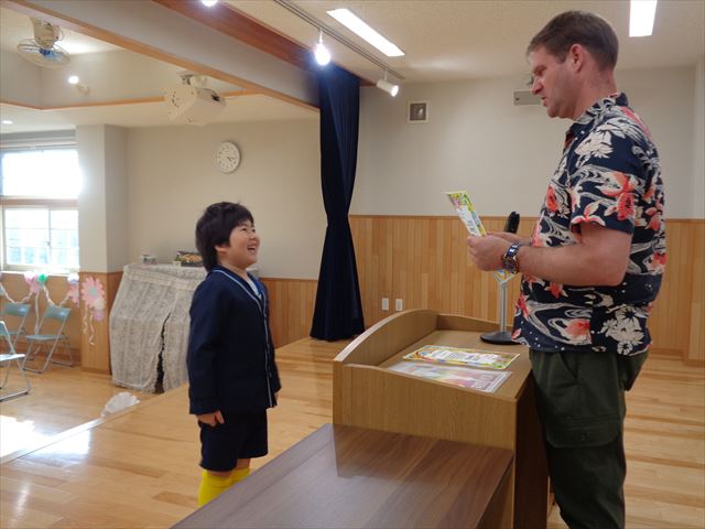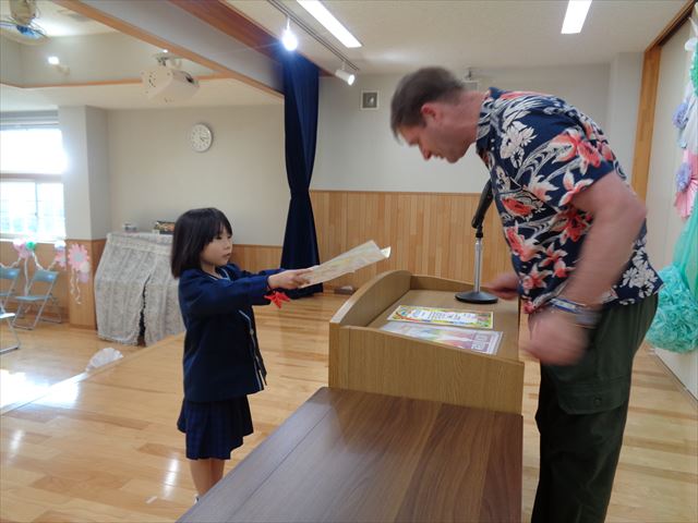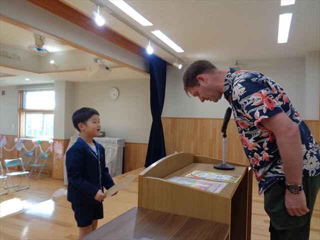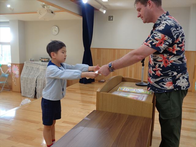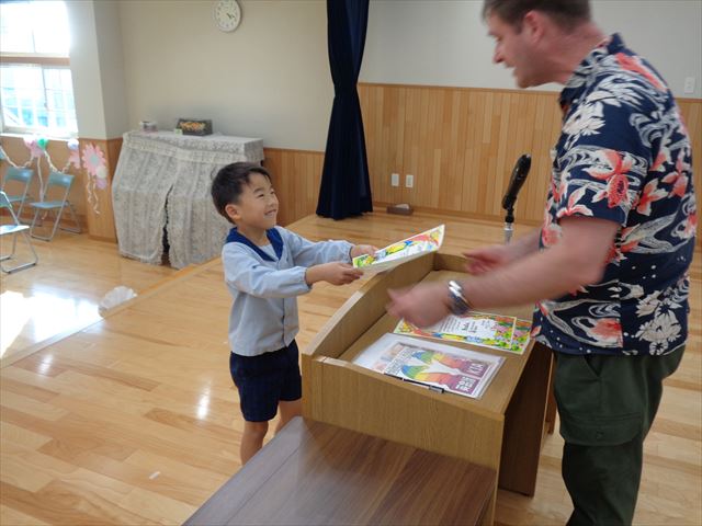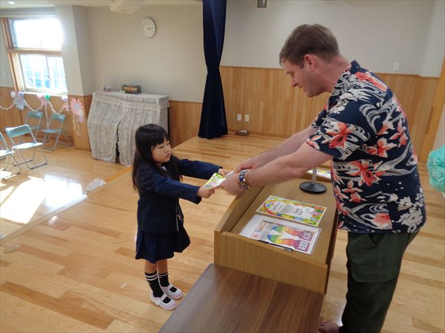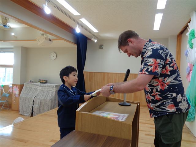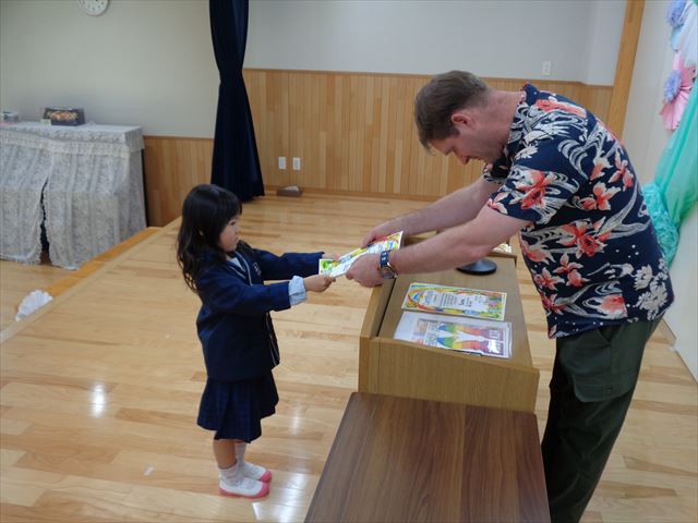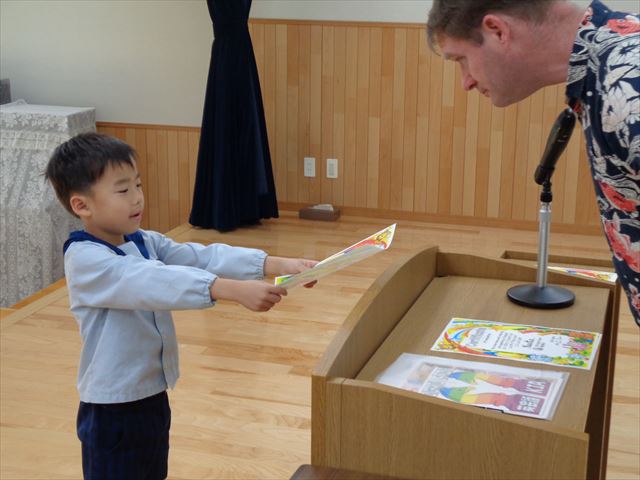 ゆりぐみさんへ英会話キアのエリック先生より修了証の授与式がありました。
