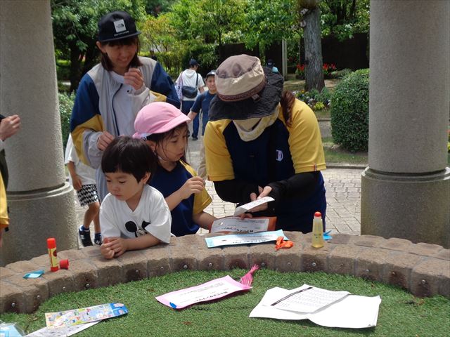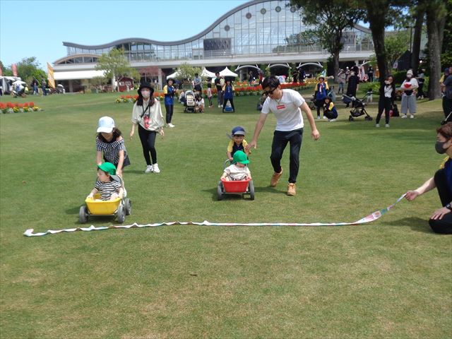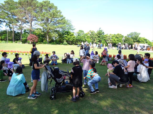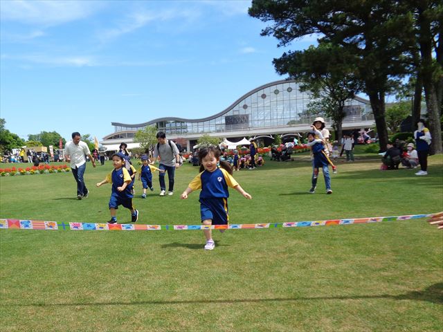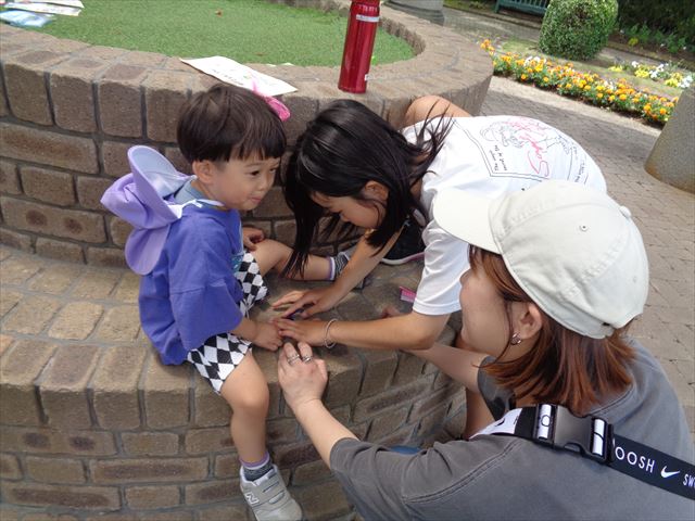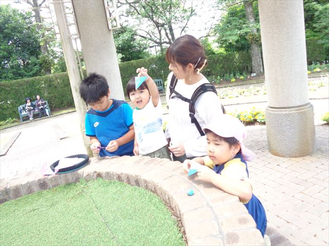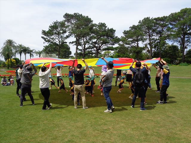「おはよう!」と元気に笑顔いっぱいの子ども達。気候も良く、かけっこをしたり、ウォークラリーをしたり広い芝生の上を思いっきり体を動かして楽しみました。