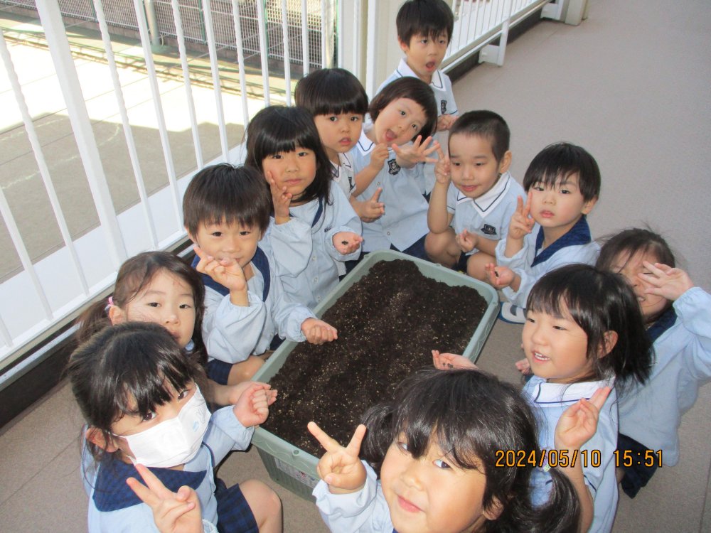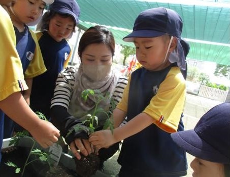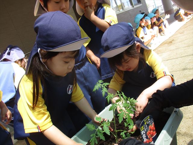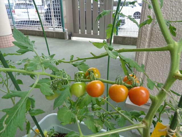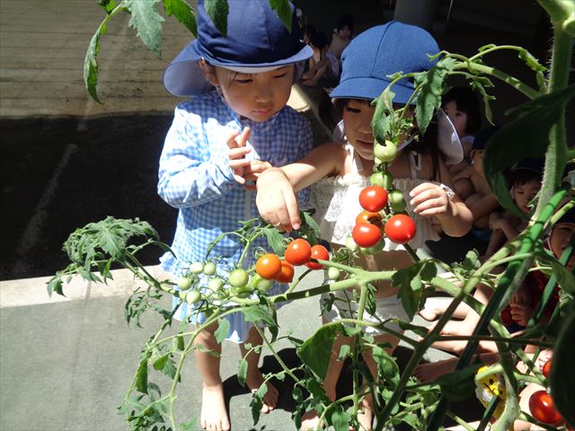 ももぐみさんはミニトマト栽培。毎日の水やりとお日様のご機嫌を見つつ、プランターは何度もお引越し。たくさんのトマトが赤くパンパンにおいしそうに実っていますね。小さなおともだちから年長さんまで、登降園時には立ち止まって、先端の赤ちゃんトマトを見つけてうれしそうに、トマトに元気パワーを送ってくれています。ももさんもみんなも収穫をたのしみにしています。