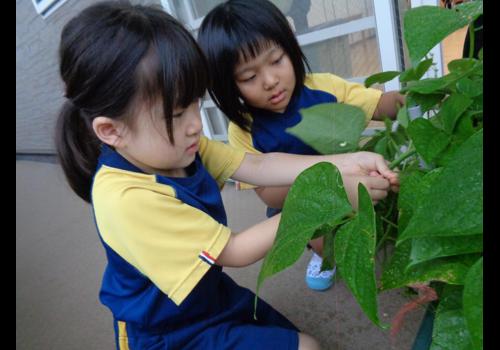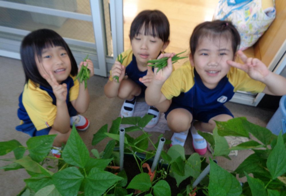 ゆりぐみさんは6月末にインゲンの収穫をしました。