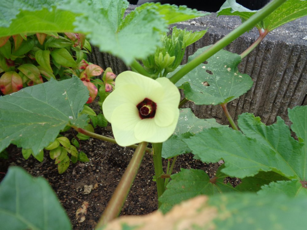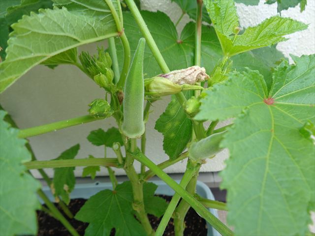 うめぐみさんはオクラを種からプランターで育てています。すくすくたくさん伸びた苗を間引いて、少しだけ園庭東側にも植えています。ある朝オクラのかわいくて黄色いお花が咲いていました。翌々日、お花が萎んでポトンと落ちた後、産毛の生えた緑の角がピヨン!と見えて毎日少しずつ大きくなってきています。たくさんたくさん大きくなーれ!