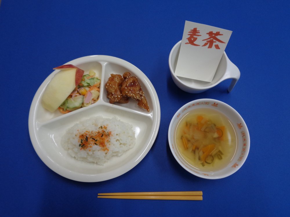 今日のごちそうは、甘辛ダレチキンとマカロニサラダ、ふりかけご飯。