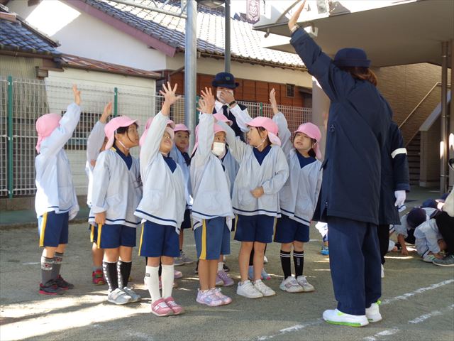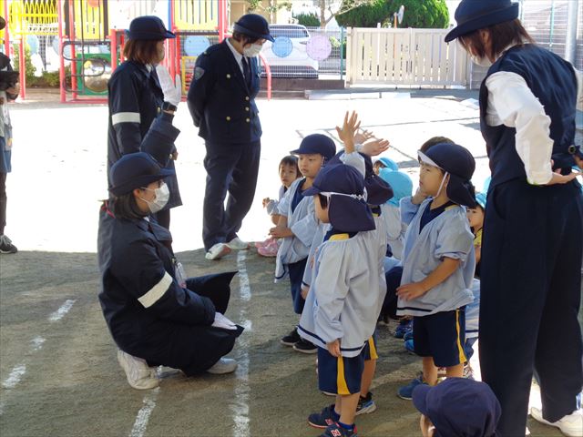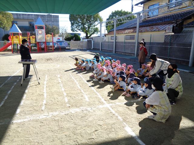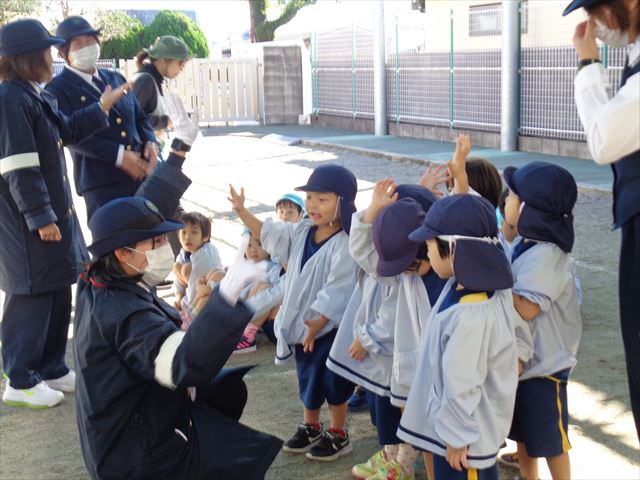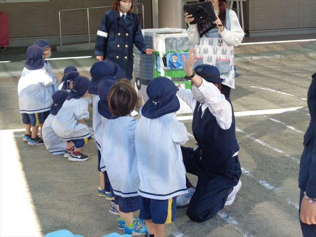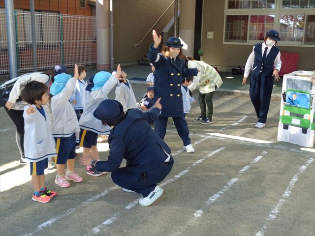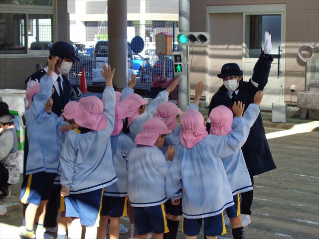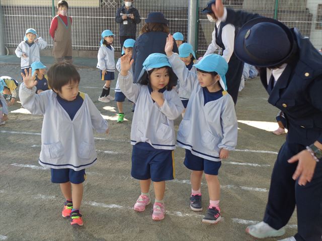 園庭にできた道路では、お約束事を守って信号や横断歩道を確認して渡ることができました。
