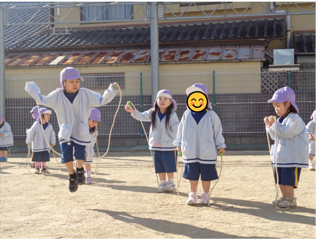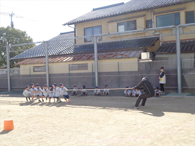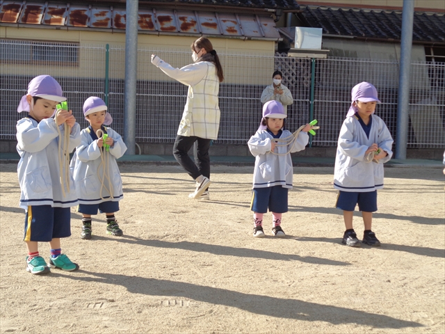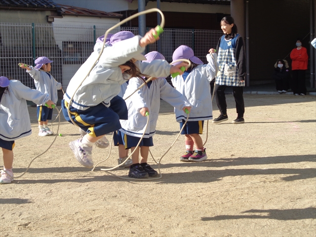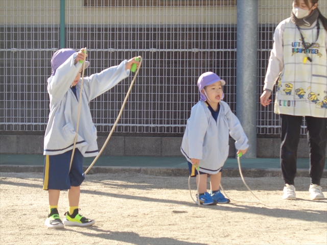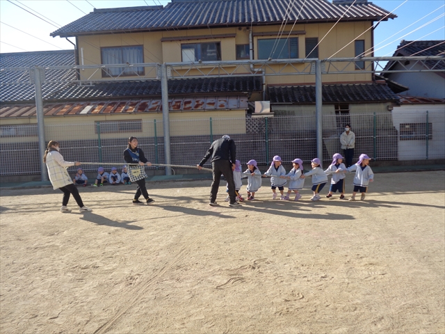 「まわしてポン!」なわとびをしたり、先生やお母さんを相手に綱引きをしたり、なわとびの縄を電車に見立てて結ぶ練習も、子ども達にとってとてもたのしい時間になりました。