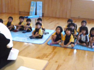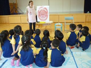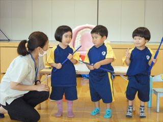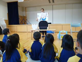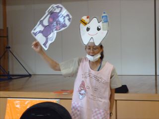 人間や動物の歯や恐竜の歯が何回生え替わるのかなど、クイズや紙芝居を楽しみながら歯みがきの大切さを学びました。