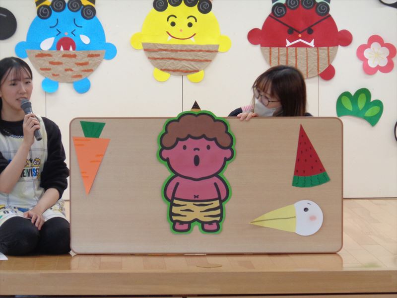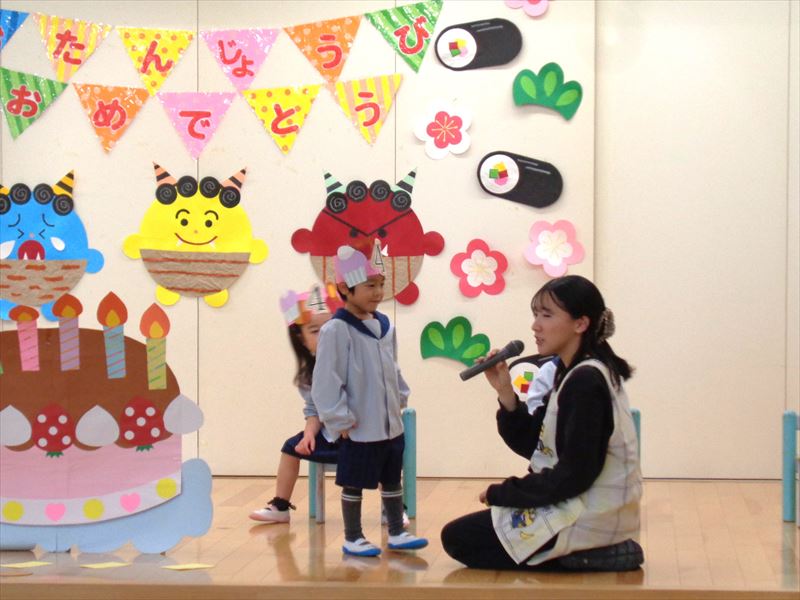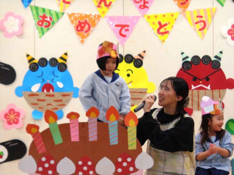 お誕生会の最後は「つの当てクイズ」。鬼さんの頭から出てくるのものが何なのかで子どもたちも大盛り上がり