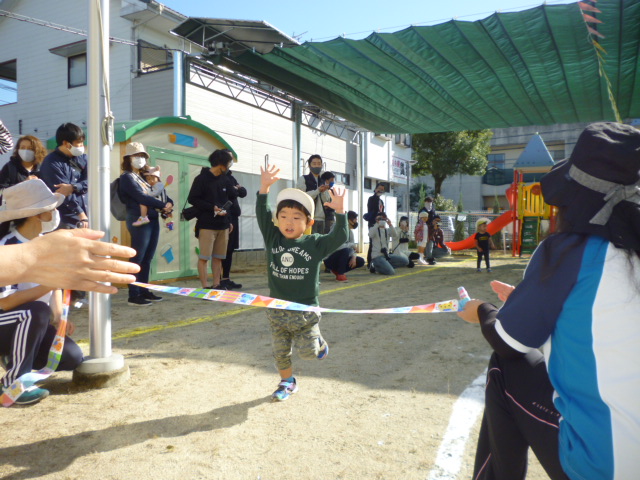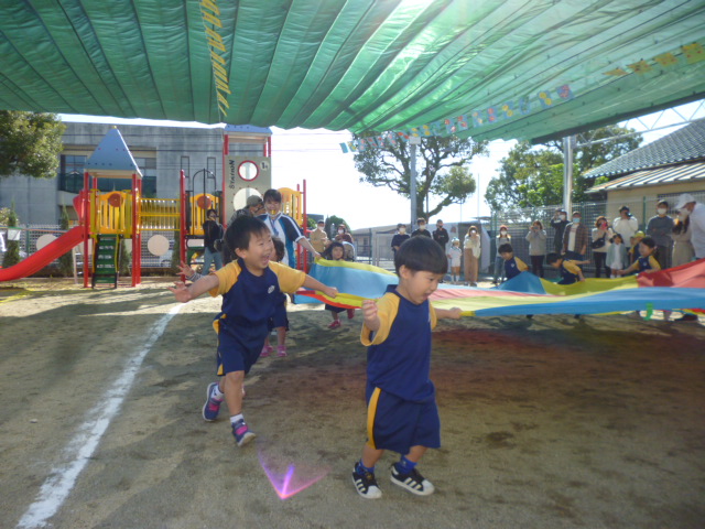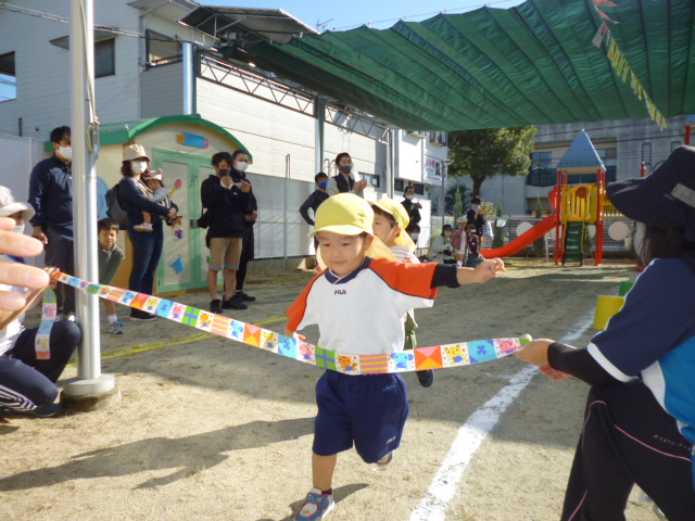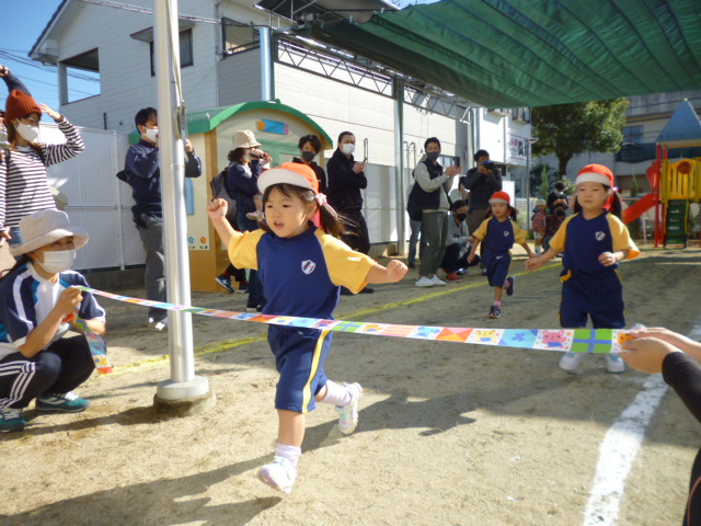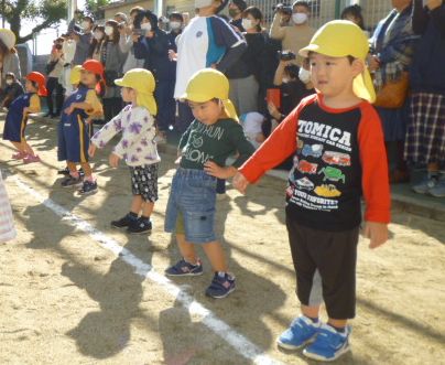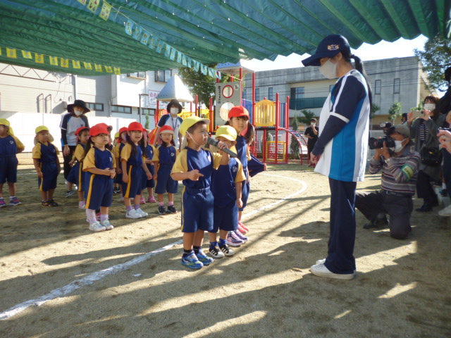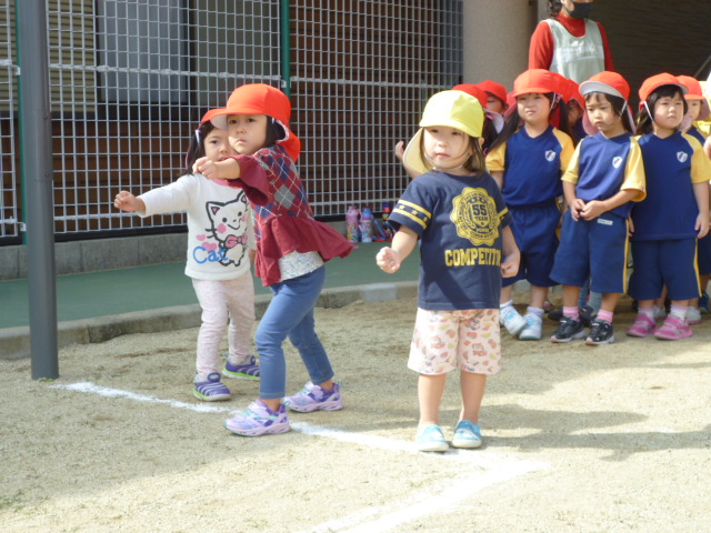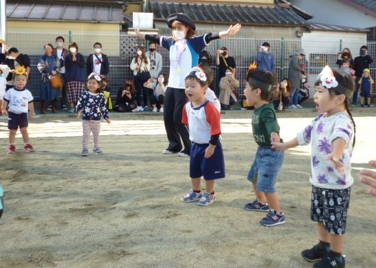 10/24(土)快晴☀運動会の日です。 今年は、園庭で2部に分けて行いました。