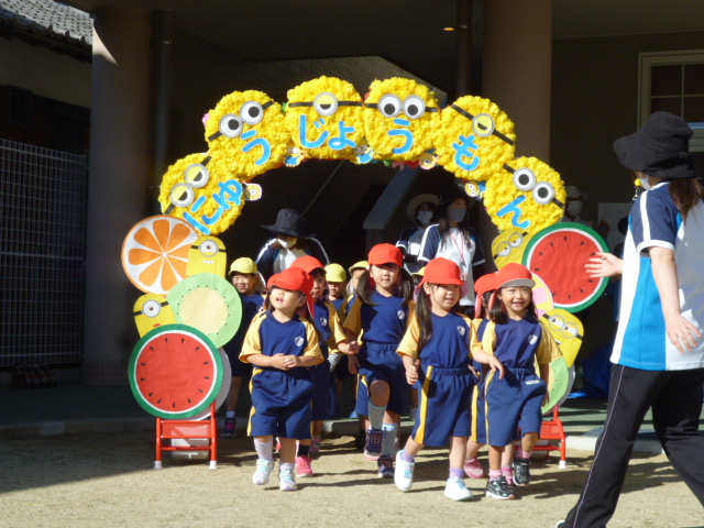 子ども達の喜ぶ姿を想いながら作ったミニオンの入場門から、入場してくるやる気満々の子ども達を見て、私たちも胸いっぱいになりました。