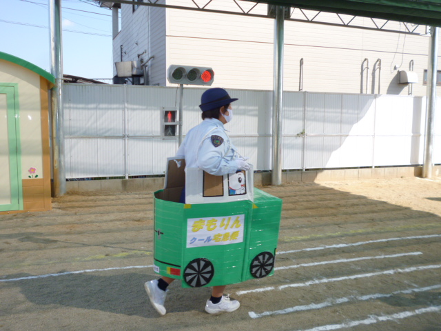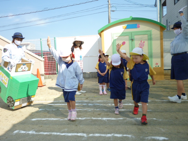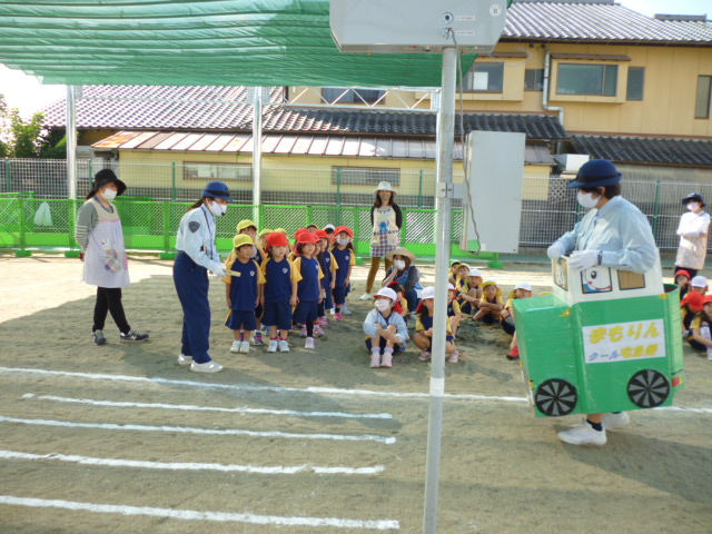 今年は、いつものおともだち「ラッキーくん」と「まもりん」はお休みでしたが、園庭に横断歩道や信号を設置していただき、指導員のおねえさんからやさしく丁寧に指導していただきました。子ども達もお行儀よくお話を聞くことができました。